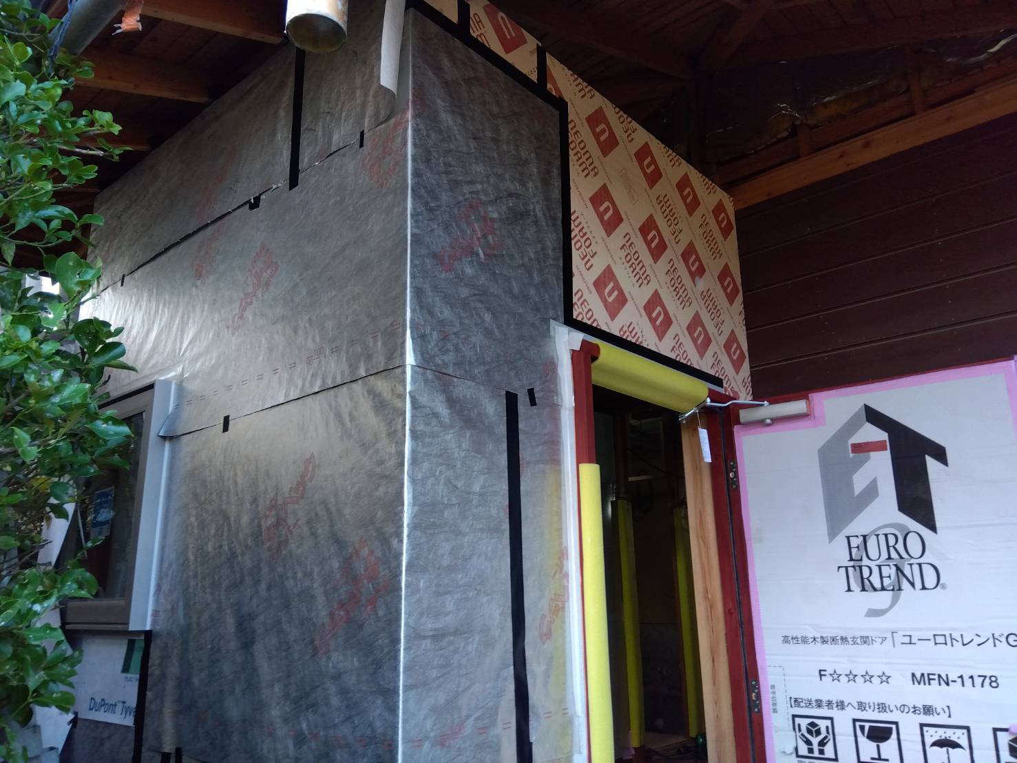 外断熱に透湿遮熱防水シートを貼っているところ。窓は樹脂製の断熱サッシペアガラス、玄関も断熱ドアに刷新しました。