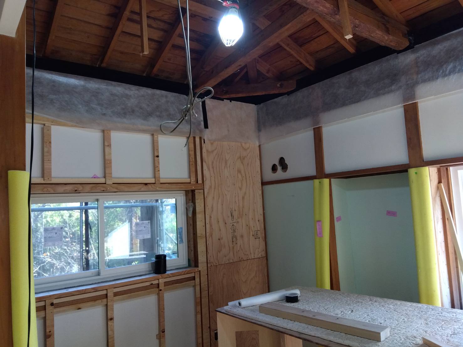 2階の天井を撤去して、桁まわりを気密シートで覆ってから新たに天井を張って、さらに気密シートを敷いて断熱材を敷き詰めます。