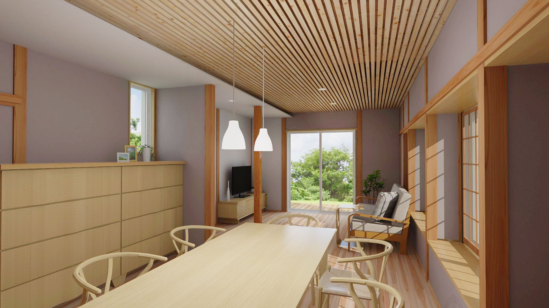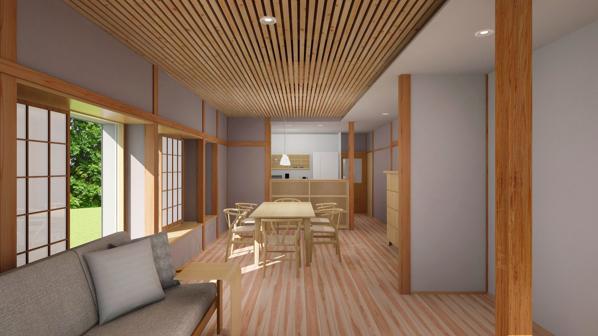 完成イメージパース2。既存の真壁や障子を生かしたリビング・ダイニング。床はクルミです。