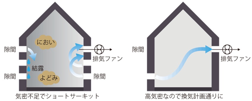 さて、気密が確保できると空気の通り道ができるので、計画換気が機能してきます。逆に、すき間だらけだと吸気口から換気扇までの空気の流れとは関係なく、隙間からのショートサーキットが生じて、部屋全体の空気は動かず澱んでしまいます。気密が確保できないと、断熱性能が損なわれるだけでなく、換気の効きも悪くなるので、皆さんもぜひ「気密・断熱・換気」の3点セットを覚えておいてください。