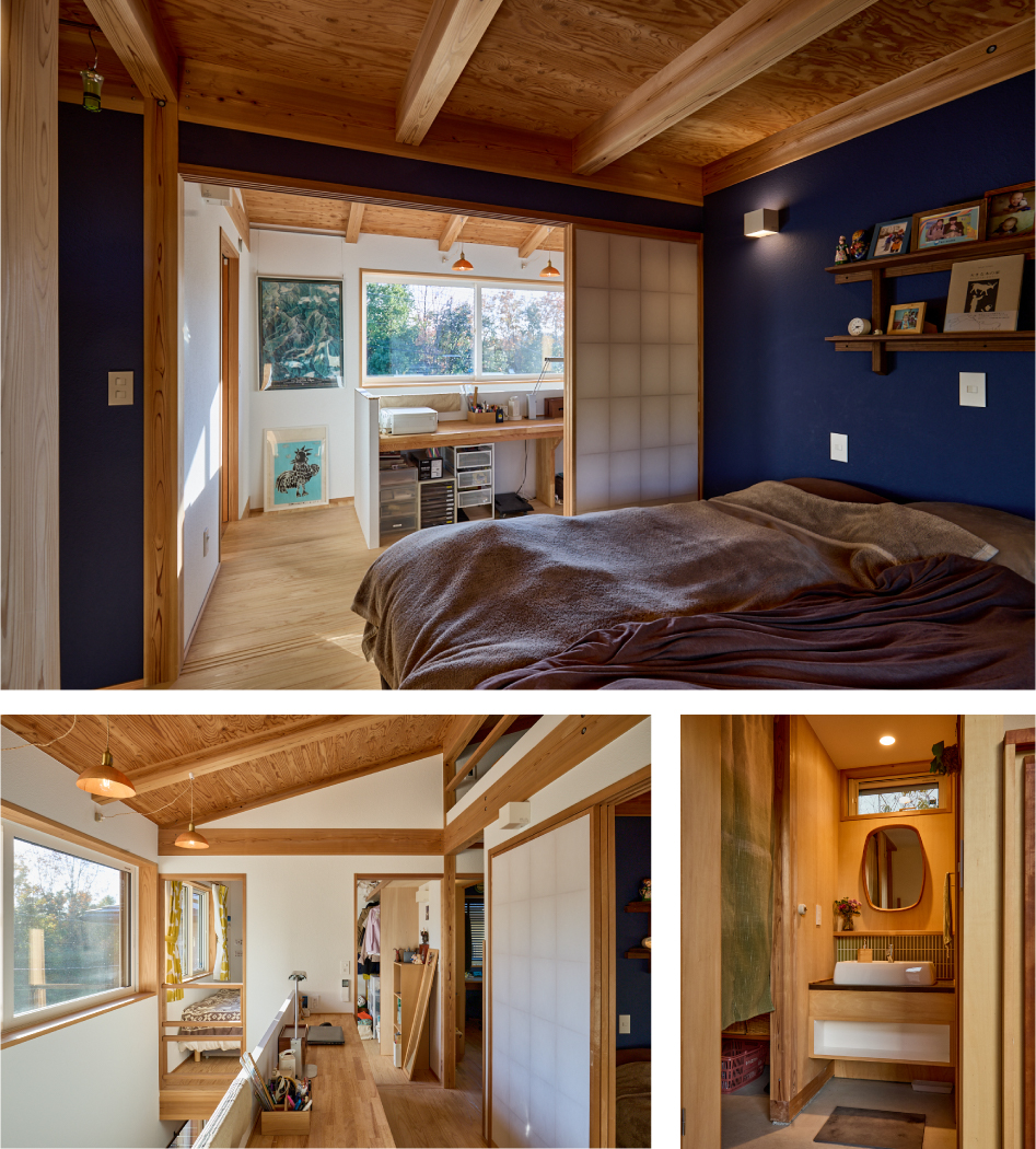 上/主寝室も引戸を開けると廊下と一体の空間に。 左下/2階吹抜けにはカウンターも設置してあり、ちょっとした作業に便利。 右下/ 玄 関土間から直接入れるトイレと洗面台は、庭も使ったコンサートをイメージして計画。鏡と手洗い器は奥様のセレクト。