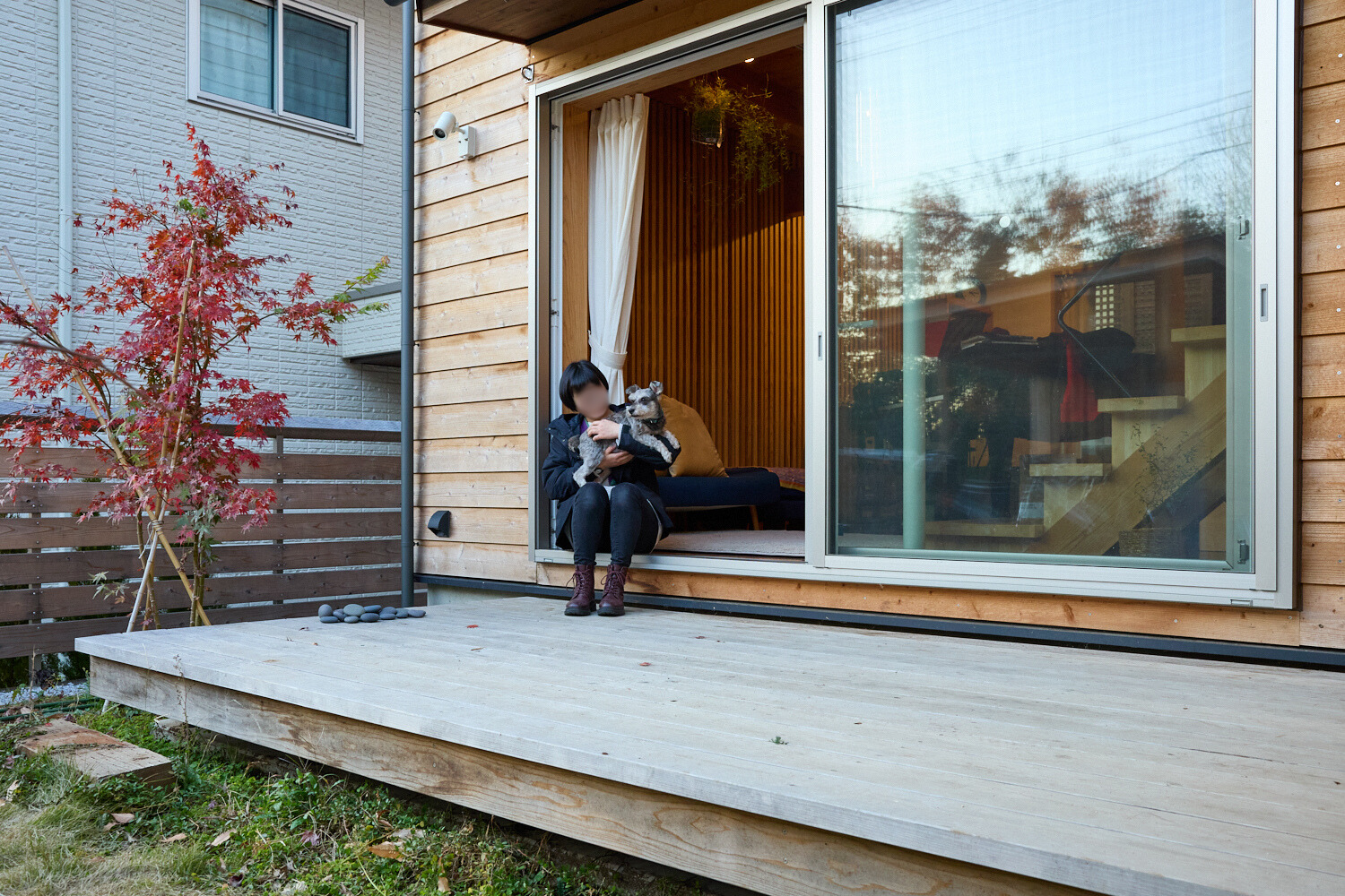 リビングから直接出入りできるデッキでは山岳部の娘さんも登山の道具のお手入れをしたり、愛犬と遊んだり。