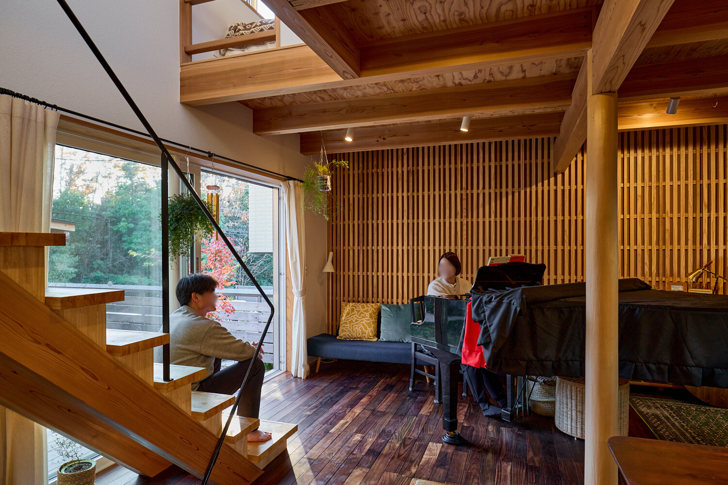一軒家でも楽器の音は外に漏れてしまうもの。この家ではリビングの壁一面に吸音と反響音を防ぐために木質繊維系下地板の上に木製格子を設置。仕上げのアクセントにもなり、窓を閉めれば音漏れも防げて、室内でもやわらかい音色になる。