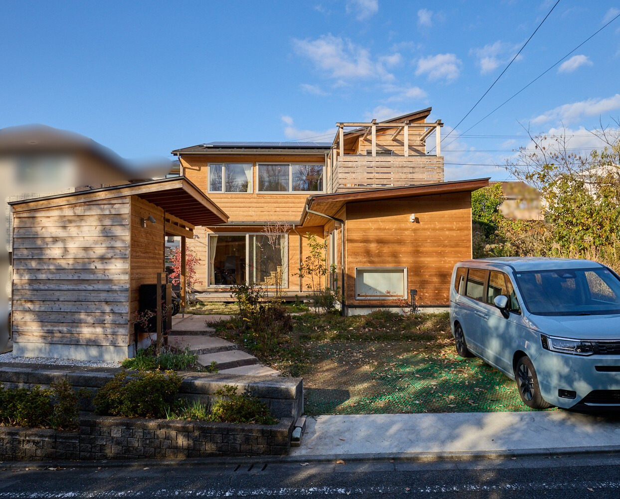 家族構成はご夫婦と娘さん息子さんの4人は南北に細長いので北と南にそれぞれ庭をとり、南庭に配置した大きなデッキと庭を囲むようにL字に建物を配置しています。通りに面した南庭には塀の代わりに小屋のような風情のある外物置を置くことで、通りからの視線をゆるやかに遮ります。