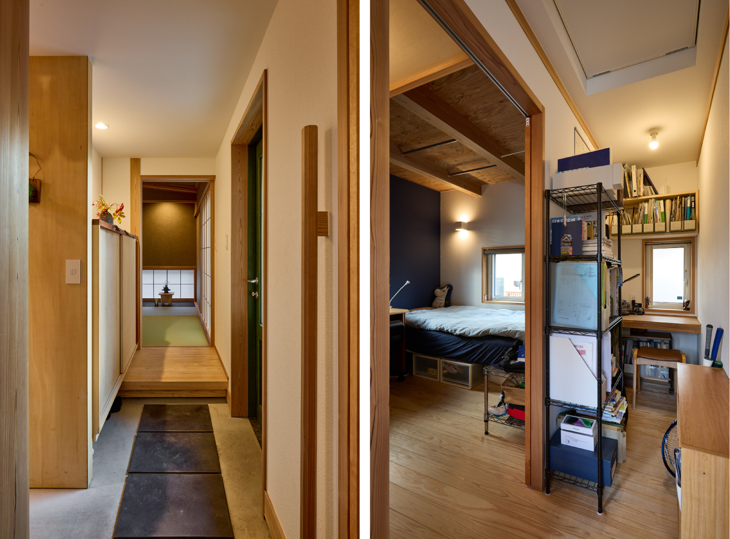 左/玄関土間の奥にある和室。右/2階の小さな書斎。普段は旦那様が使っている。