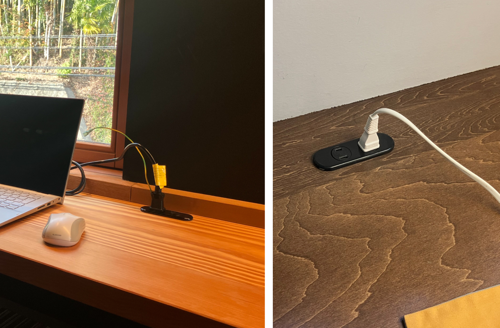 カウンターの上に取付けたコンセント。使わないときには抜いておいたり、作業の合間にパッとお掃除したりが簡単にできます。