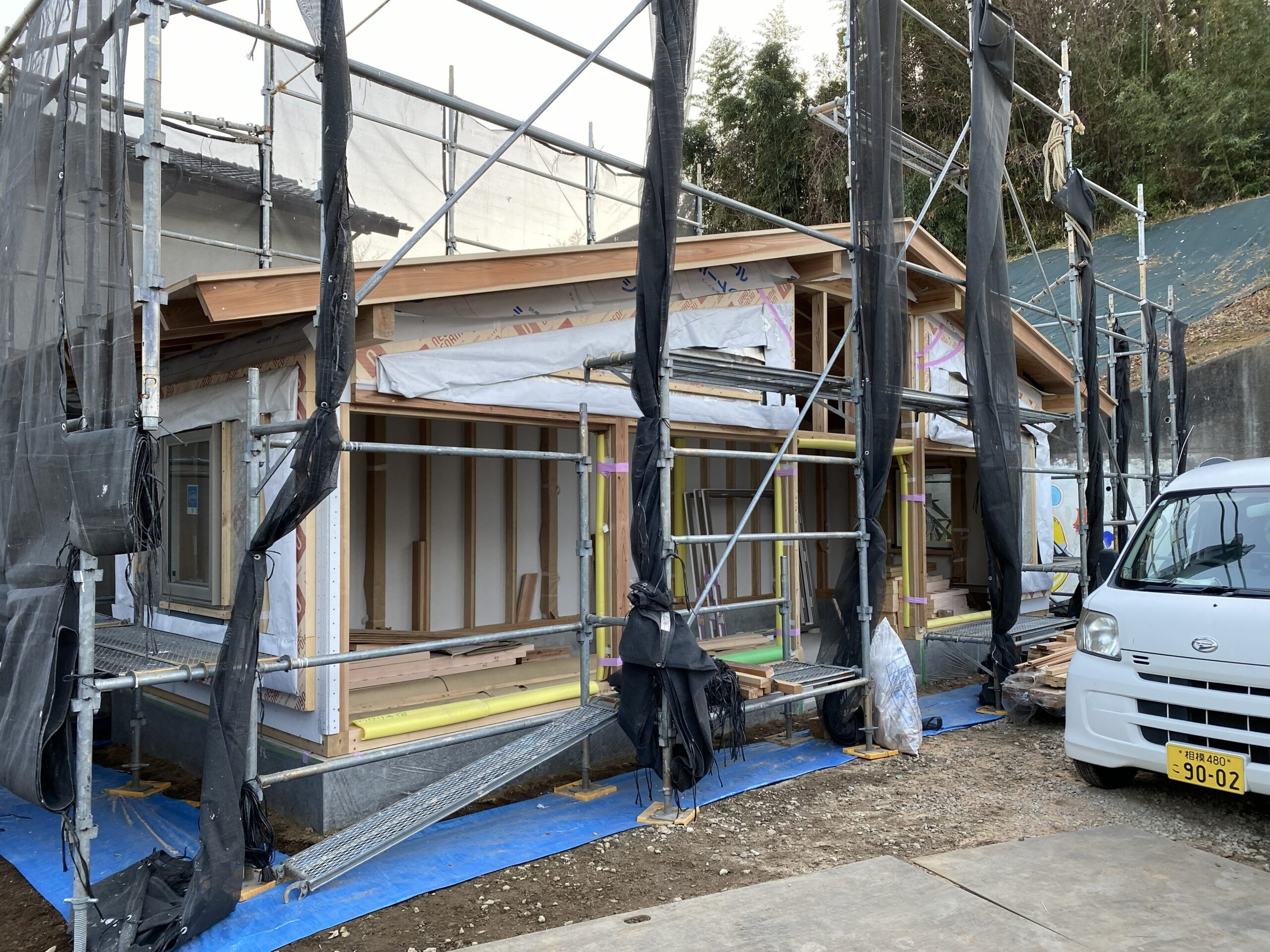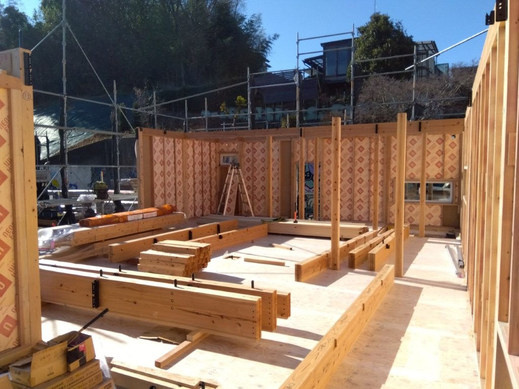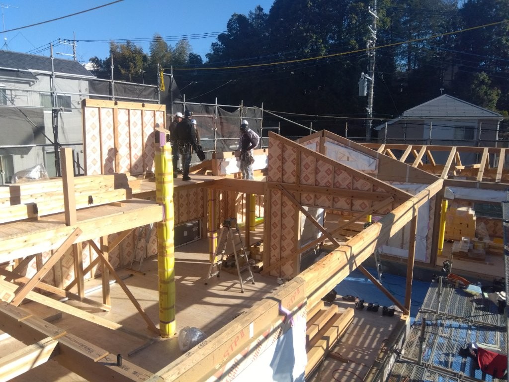 窓や断熱材まで工場で組み込まれる「大型パネル」を採用し、何台もの大型トラックで搬入されるため、現場での組み立ては驚くほどスムーズ。一気に立ち上がり、あっという間に家の形があらわれました。