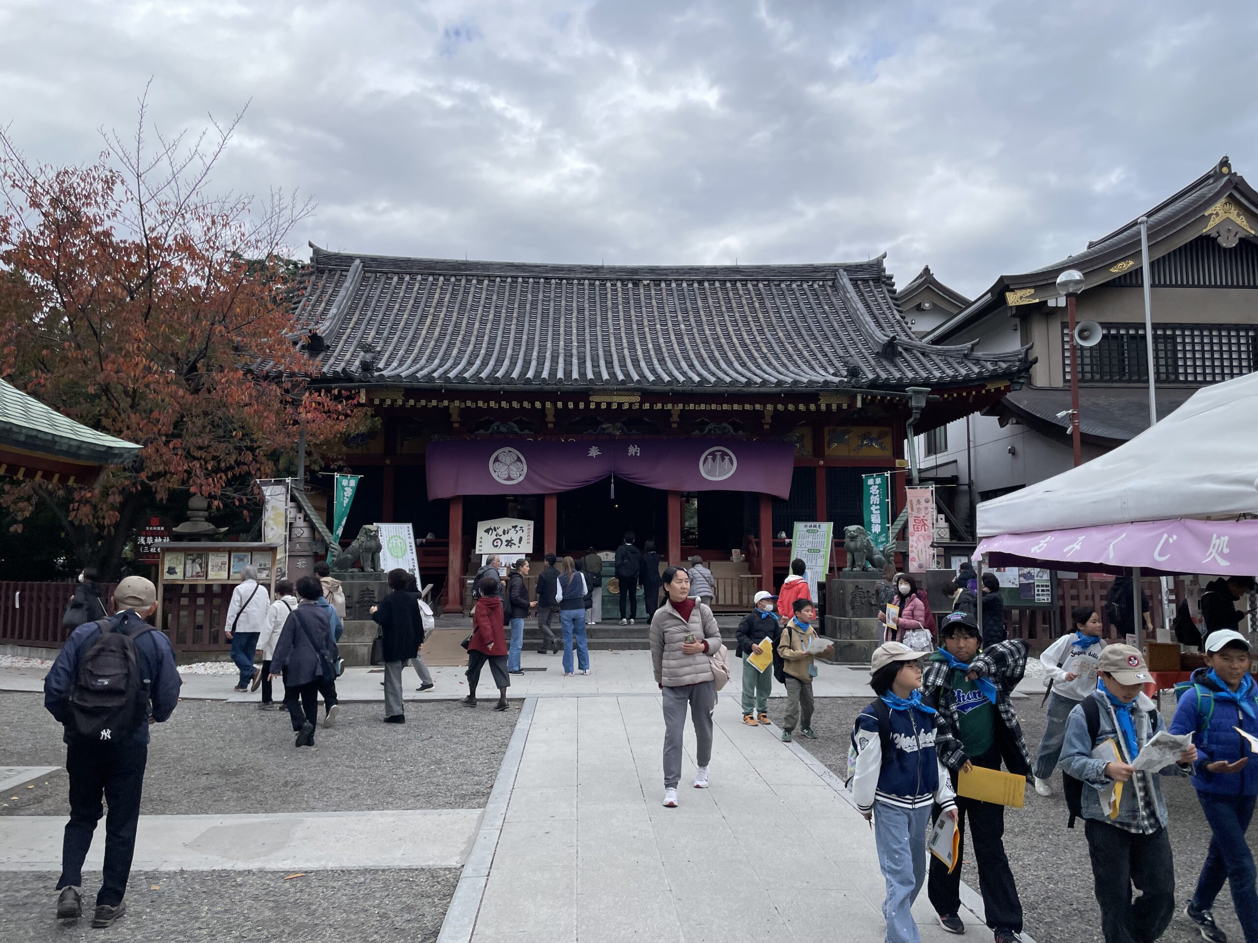 今回の建築まち歩きは、浅草寺境内本堂右奥に建つ三社祭(三人を祭っているのでこの名がついている)で有名な「浅草神社」鳥居前からスタートしました。