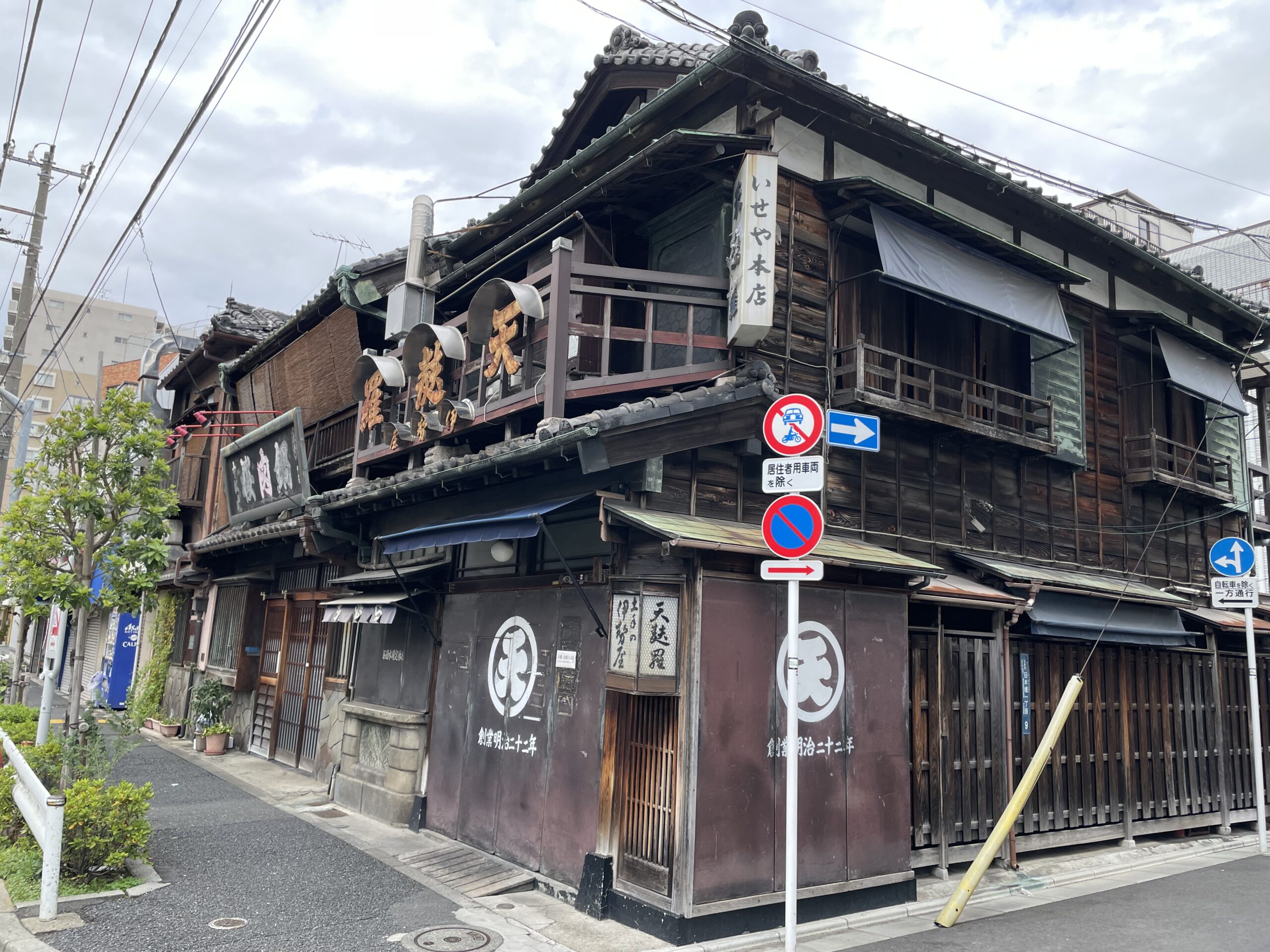 目指すは、山谷堀(現在は緑道)に並走する旧日本堤、現土手道を経て大河ドラマ「蔦屋重三郎」でおなじみ「新吉原」へ向かいました。建築家岡田信一郎兄弟設計の洋瓦葺きのRC造3階建ては本堂兼住宅になっていて、浅草寺住職や関係者の家だそうです。それら棟が一画にまとまって並ぶ路地が長屋のようで面白い。その新吉原から山谷堀へ出て江戸時代にくず紙を洗って、色の黒い粗末な紙で落し紙に使う「浅草紙」を再生製造していました。新吉原に出る手前に、木造の登録有形文化財2棟(1927)の天麩羅屋と馬肉鍋屋がくっついて残っています。